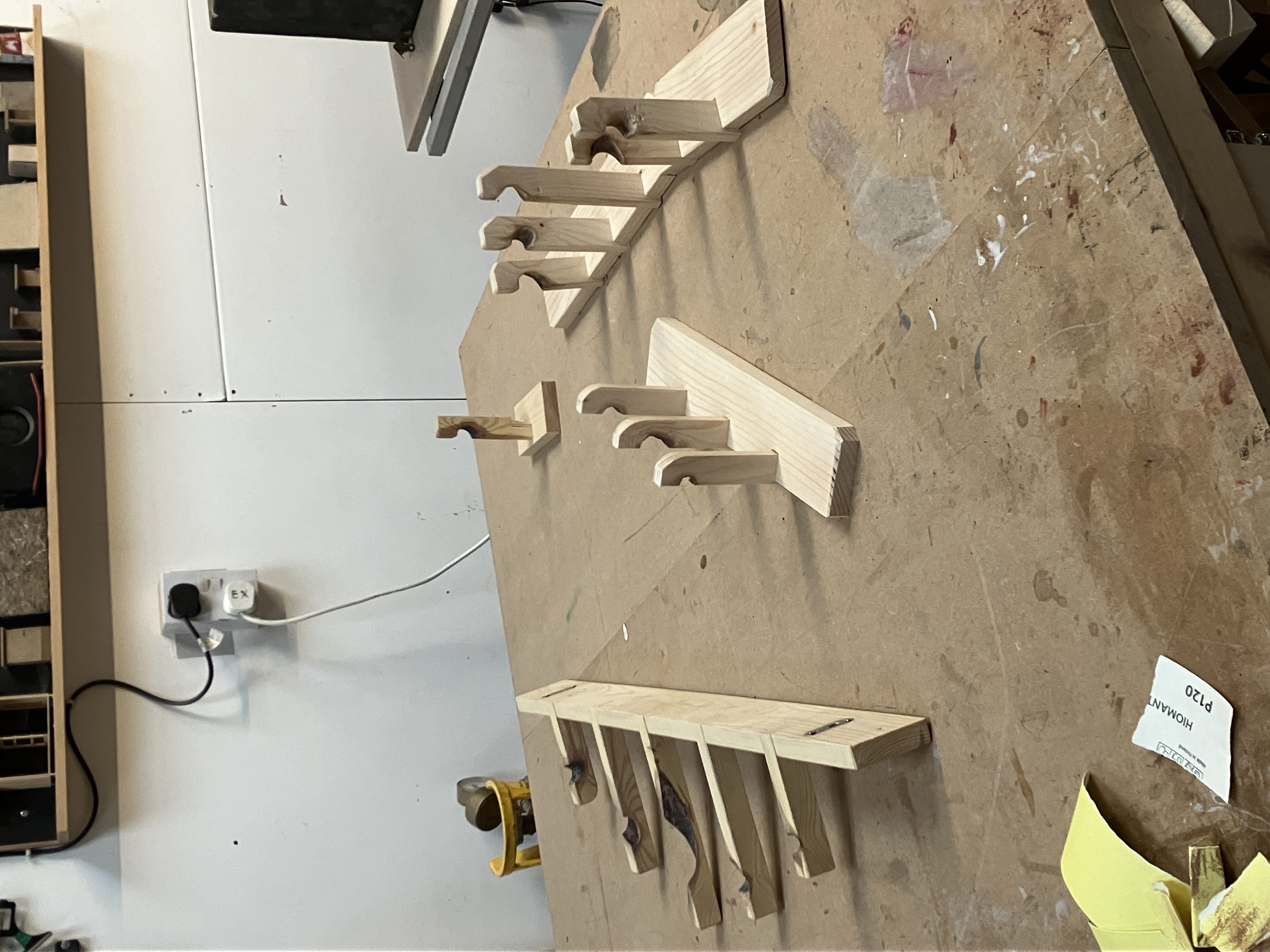 A simple coat peg rail design made utilising found knotty sections of pinewood.